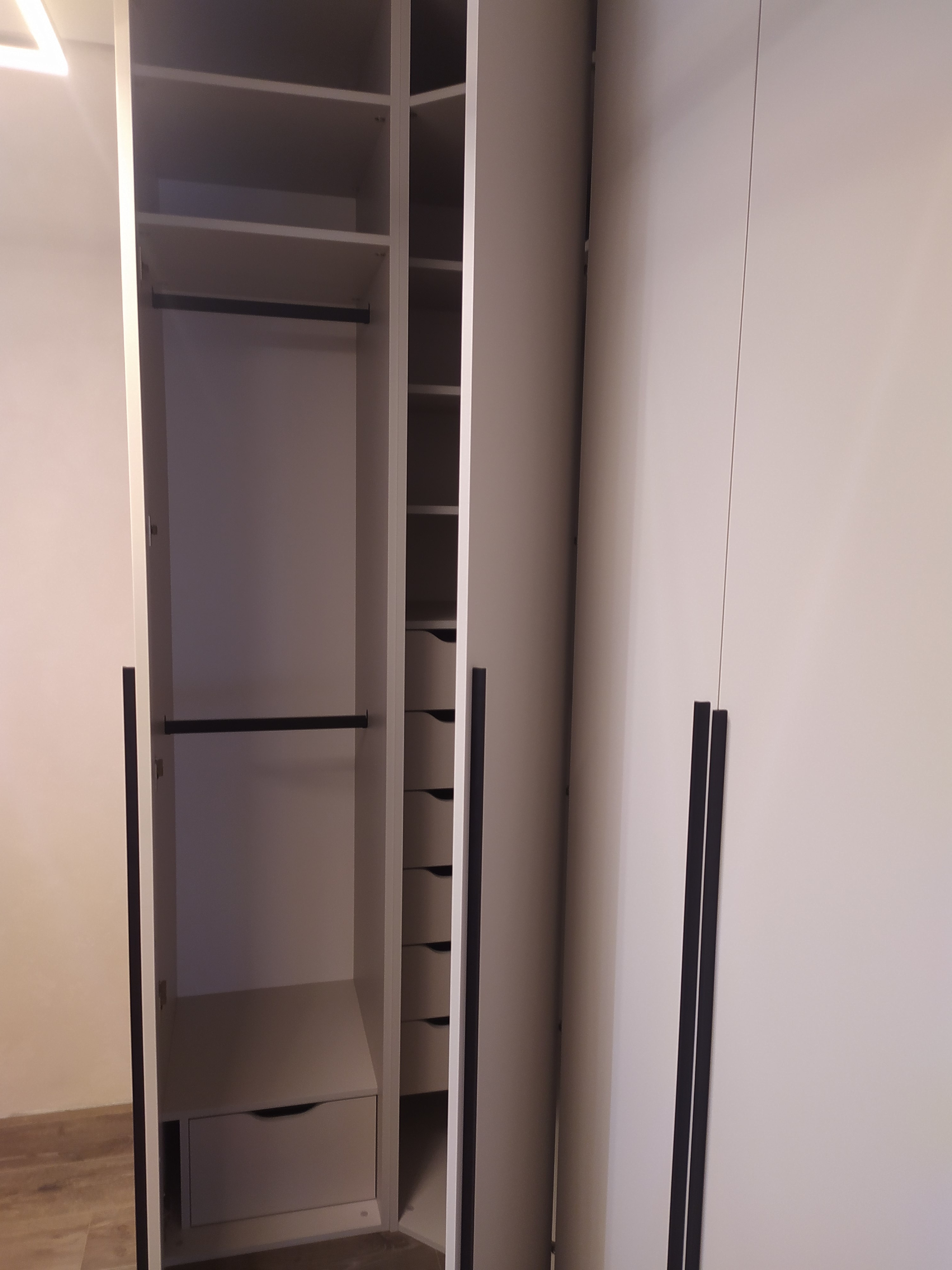 Шкаф в детскую из 4 секций. Высота 2600, глубина 600 мм. Корпус Egger U702 ST9. Видимые боковины и фасады Egger U702 PM. Петли BLUM, ящики кв. Цена: 250 500 ₽