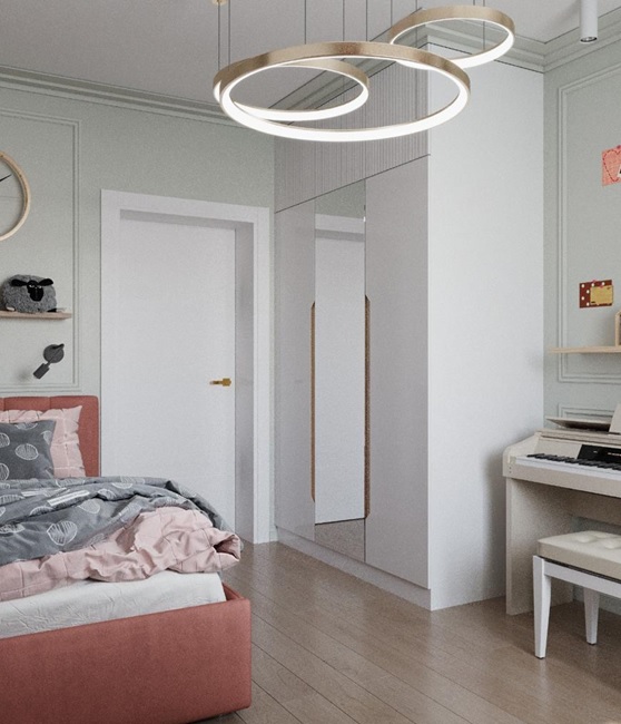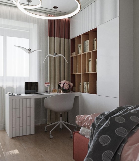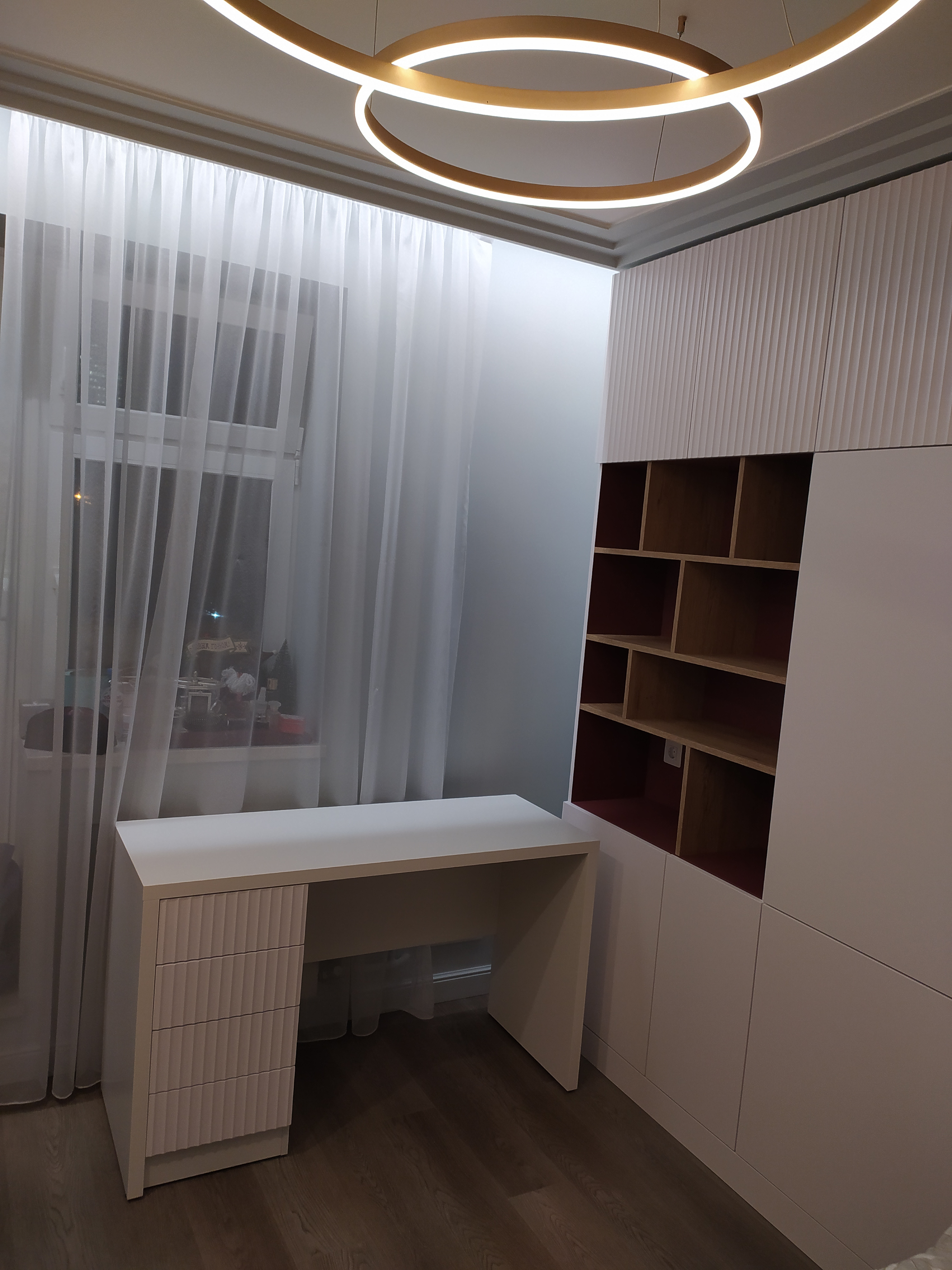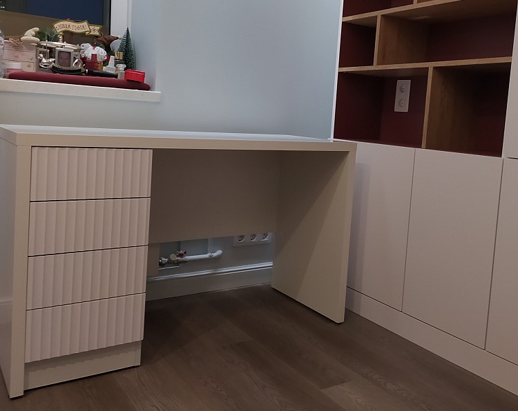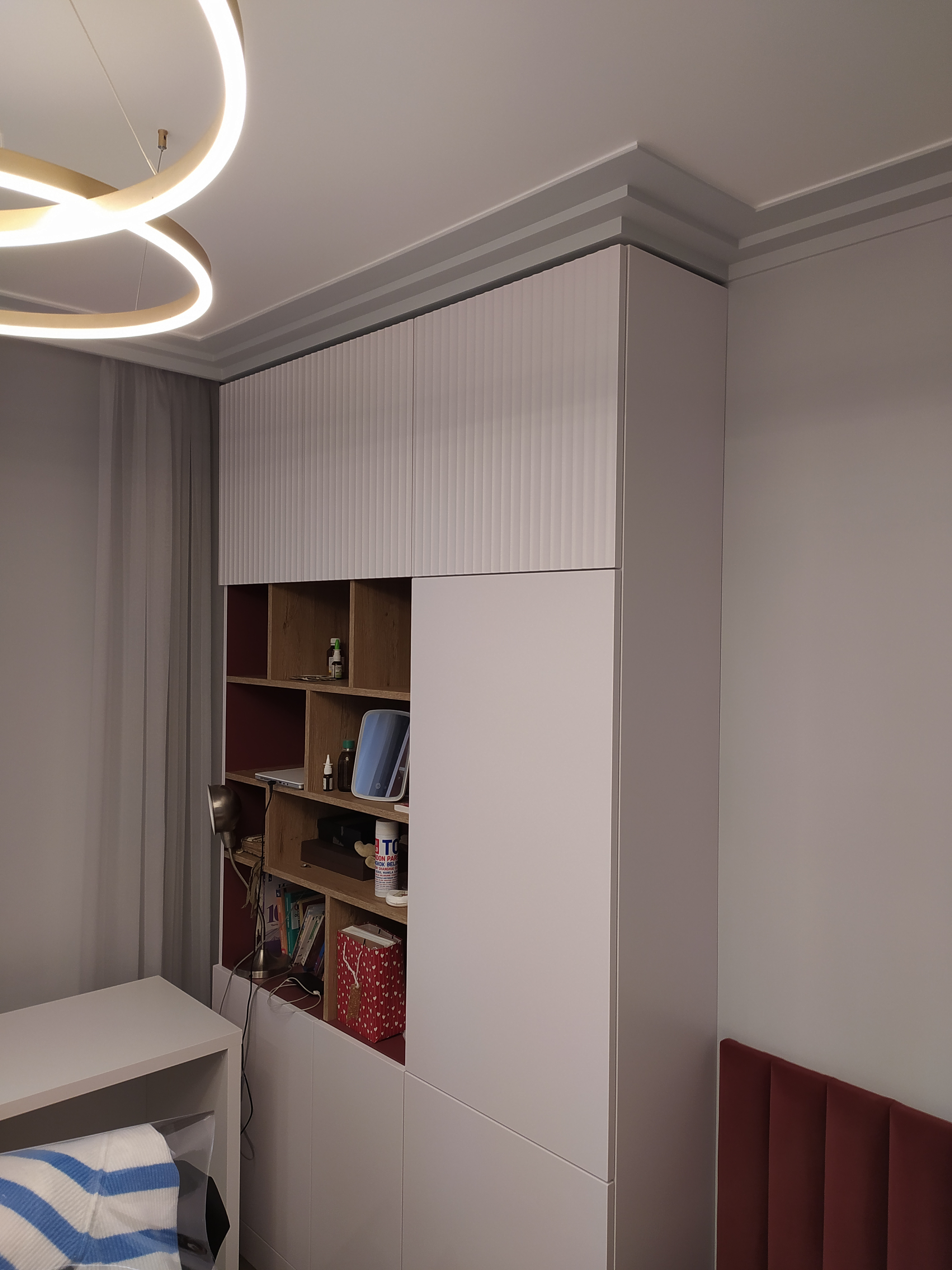 Фасады: эмаль матовая (интегрированная ручка Дуб Антор натуральный + волна) NCS S 0502-R50B + внутренняя часть открытых полок NCS S 5030-R10B,